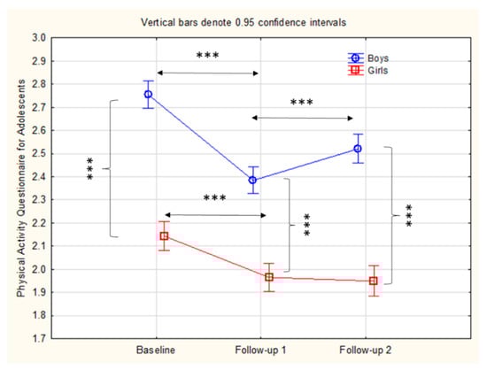 Figure 2 evidences the changes in PALs for boys and girls, as well as the significance of the post-hoc differences between and within genders. The boys had higher PALs than the girls at baseline, FU1, and FU2. The PALs of the girls decreased continuously from 16 to 18 years, with non-significant differences between 17 and 18 years. Meanwhile, the PALs among the boys decreased between baseline and FU1, but slightly increased from FU1 to FU2.