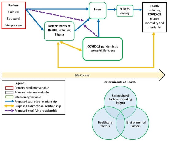 Overall, the Weathering Hypothesis comprehensively connects the socio-ecological model with the life course model to illustrate the significantly disparate health trajectories that African Americans and Whites experience, and it has also been heavily supported in research studies during the past few decades. Therefore, we propose an integrated Weathering Framework to depict predicted relationships between racism, stigma, COVID-19, and health outcomes among African Americans. In the conceptual diagram (Figure 1), the blue arrows represent proposed causative links, the yellow arrows denote proposed bidirectional relationships, and the purple dotted arrows signify proposed modifying relationships. At the crux of this framework and as substantiated in the literature, racism (including cultural, structural, and interpersonal forms of racism) is a root cause of diminished health and wellbeing among African Americans. We posit that racism operates through, or interacts with, the multiple determinants of health to yield both acute and chronic experiences of stress. In other words, the determinants of health likely partially mediate the associations between racism and stress; additionally, the experience of racism also likely modifies the impacts of negative determinants of health, thus leading to increased stress. In the proposed framework, we also acknowledge that repeated exposures to interpersonal racism are directly associated with chronic stress [,].