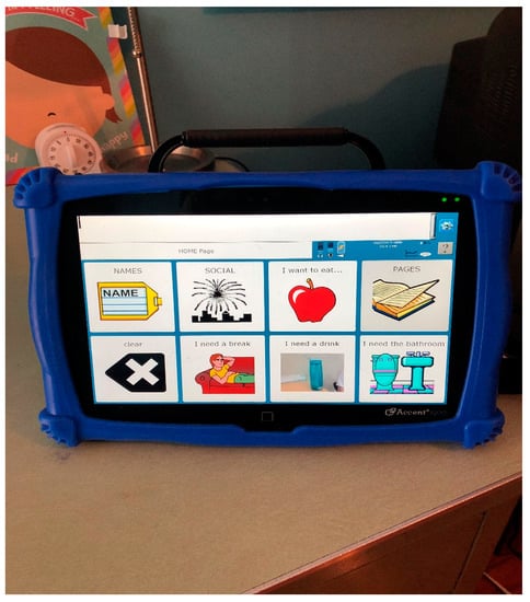 Johnny still uses PECS on a regular basis, and he also uses an “aug-com” device (Augmentative Communication). These devices are like large iPads and they talk for the child. Johnny uses an Accent 1000 device, which has pictures that talk when pressed (Figure 2).