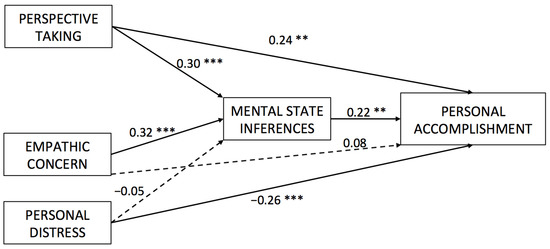 Direct paths from dimensions of empathy to personal accomplishment through the inference of mental states. ** p < 0.01, *** p < 0.001.