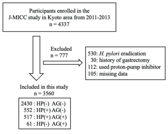 This cross-sectional study included 4337 individuals enrolled in the Japan Multi-Institutional Collaborative Cohort Study in the Kyoto area, from 2011–2013. The Japan Multi-Institutional Collaborative Cohort Study is a new cohort study, launched in 2005, to examine gene–environmental interactions in lifestyle-related diseases []. We excluded participants who had received H. pylori eradication therapy (n = 530) or who had undergone gastrectomy (n = 30). Further, participants who used a proton-pump inhibitor (n = 112), or who had missing medical information data (n = 105), were excluded. This left 3560 participants (1127 men and 2433 women) eligible for analysis. Figure 1 shows flow chart of the study participants. The study protocol was approved by the ethics board of Kyoto Prefectural University of Medicine (ethical approval number, RBMR-E-289), and written informed consent was obtained from all participants.
