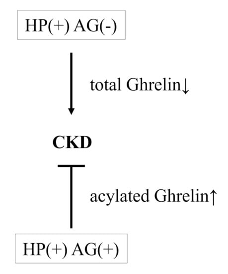 These results suggest that the prevalence of HP (+) AG (−) status is higher in CKD and may have relationship with the risk of CKD, an effect that has been speculated by one mechanism: that H. pylori infection reduces ghrelin secretion. Ghrelin, a gastrointestinal peptide hormone, is known to perform a plethora of central and peripheral actions in distinct areas, including gut motility, gastric acid secretion, and glucose metabolism []. There are two different circulating forms of this peptide: acylated ghrelin, the active form that binds to receptors, and des-acylated ghrelin, the inactive form without affinity for receptors [,]. The level of acylated ghrelin is more important than total ghrelin in terms of clarifying the effect of ghrelin. Ghrelin can improve CKD via complex interactions affecting energy homeostasis, appetite, muscle mitochondrial activity, suppression of inflammation, and maintenance of the cardiovascular system [,]. H. pylori infection is associated with decreased ghrelin production and with a reduction in the number of ghrelin-producing cells [,]. In contrast, higher levels of acylated ghrelin have been observed in patients with chronic AG compared with healthy participants []. This suggests that there may be a compensatory increase in plasma acylated ghrelin concentration in response to AG, a condition that results in a loss of ghrelin-producing cells and an increase in gastric pH []. Therefore, in this study, we speculate that the HP (+) AG (−) and HP (+) AG (+) were observed association with CKD may be due to decreased or increased levels of acylated ghrelin caused by H. pylori infection with/without AG. Furthermore, there was no difference in the relationship between CKD and lifestyle factors and medical history between the control and HP (+) AG (−) group. In sum, H. pylori infection may induce renal dysfunction via reduction of ghrelin, and further studies should be conducted to confirm this hypothesis (Figure 2 showed the hypothesis in this study.).