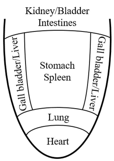 The pulse is taken on both sides at three palpable depths related with “qi”, “xue”, and organs [61]. The deeper level corresponds to the “yin” and at the superficial level to the “yang” physiological regulation aspects or, in another language, the deeper level to the “yin” organs (solid organs) and at the superficial level to the “yang” organs (hollow organs) [62]. The two-depth method is commonly taught in Australia, Europe, and the USA and is frequently used by practitioners of these locations [61]. The three areas of the wrist are related with the so-called “Triple Burners”, and so the front position corresponds to “Heaven” and reflects the diseases from the head to the chest; the middle position corresponds to “Man” and reflects the diseases from the diaphragm to the umbilicus; and the lower position corresponds to “Earth” and reflects the diseases from the umbilicus to the feet [63].