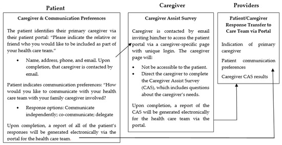 Thus, while we understand why caregiver integration is needed and that it is recommended, much less is known about how to do this in a systematic manner. To address this need, we have developed an integrated caregiver patient-portal system (i.e., patient–caregiver portal) that (1) allows a patient to identify their primary caregiver and their communication preferences with that caregiver involved in the healthcare setting; (2) connects the caregiver to a unique portal page to indicate their needs; and (3) informs the healthcare team of patient and caregiver responses to aid in integrating the caregiver (See Figure 1). This approach does so by capitalizing on existing technology used broadly in healthcare—i.e., an existing patient-portal system.