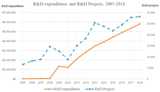 In part due to the influence of technologies, different industries have various forms of innovation patterns and technological changes [32,33], and firms in different sectors respond to uncertainties in a variety of industry-specific patterns [34]. The pharmaceutical industry has a long-standing record of innovation over the past 200 years and firms in this sector are always research-intensive. According to the Organization for Economic Co-operation Development (OECD)’s Classification of Manufacturing Industries into Categories based on R&D Intensities [35,36], the pharmaceutical industry is one of the five top high-tech sectors, leading R&D in both direct (e.g., technological development) and indirect (e.g., technological use) applications. In recent years, pharmaceutical firms in emerging economies have invested substantial R&D costs related to medication and clinical tests [37]. Taking China as an example, the R&D expenditures spent across pharmaceutical industries increased from 281.09 million to 58.09 billion Chinese yuan between 2005 and 2018. Similarly, the number of R&D projects carried out in pharmaceutical sector increased from 6581 to 28,167 over the same years [26]. The details of R&D expenditures and projects for pharmaceutical sector in China between 2005 and 2018 are shown in Figure 1.