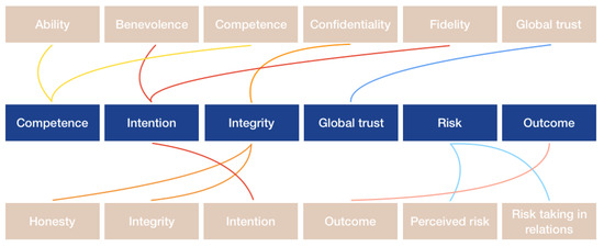 Trust conceptual framework including the six integrated concepts with their dimensions.