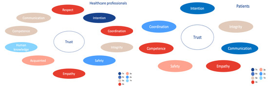 Concerning the theoretical framework and its concepts, the factor communication is a sub-category of competence. Coordination would be an element of communication but could also be categorized under the overarching concept competence, because coordination is necessary to achieve the best results. The factors empathy and safety would fit in the concept intention. Furthermore, it speaks volume that HCPs and patients are in line regarding the relevant factors of trust of patient toward HCPs on a basic level. It should be kept in mind that the mind maps were constructed with little explanation from the respondents’ side.