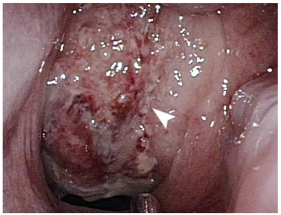 A mass, indicated by a white arrow, with a necrotic surface and multiple bleeding spots occupies the entire nasopharynx.