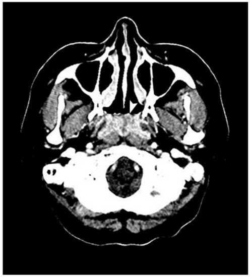 An axial view of a computed tomography scan reveals a mass, indicated by a white arrow, in the entire nasopharynx with ill-defined margins and heterogenous enhancement but that did not extend to the lateral pharyngeal space.