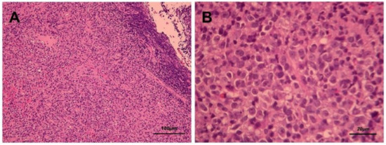 Hematoxylin and eosin staining (A. 100× and B. 400×) presents diffuse polymorphous infiltrates of lymphoid and plasma cells with scattered mitotic features in the nasopharyngeal mass.