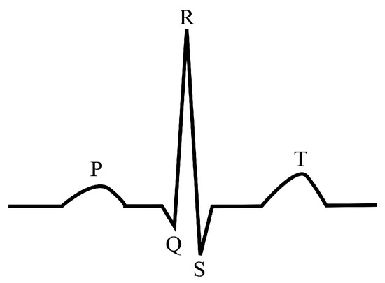 The electrocardiogram (ECG) is a random and unstable signal that records the electrical activity of the heart, and the ECG signals obtained in different environments and from individuals are significantly different. The P wave, QRS complex and T wave are the main components in the ECG waveform (see Figure 1) [1], and the accurate detection of them is important to ECG signal analysis. The QRS complex is the dominant feature of the ECG signal and its accurate detection is an important issue in many clinical conditions [2]; for example, the RR interval is used for heart rate measurement and diagnosis of several abnormalities—ventricular hypertrophy [3], conduction abnormalities [4], etc.