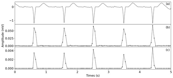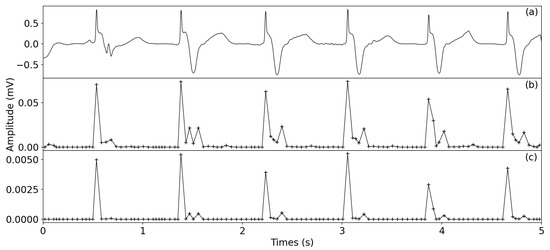 where and represent the amplitudes of the ith sample in the original ECG signal and denoised signal, respectively; M represents the filter length, which is set to 5 samples.