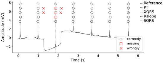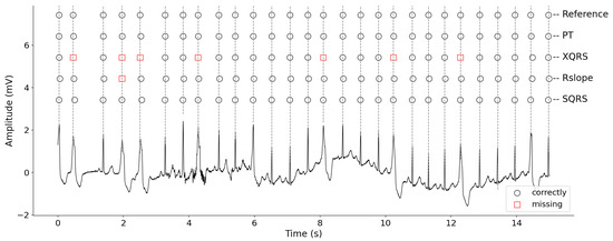 Figure 5 presents an ECG segment with an obvious waveform distortion caused by large baseline wander, and the R-peak detection results produced by different methods. Compared with the reference labels, there are several obvious errors for PT, XQRS and Rslope methods, which are marked by red rectangles and Xs. However, our method can deal with this case very well. In other words, the proposed method effectively suppressed the noise. Then, R-peak detection results were more carefully analyzed using record 208. Figure 6 shows the original ECG signal from 15 to 30 s and the R-peaks locations detected by different detectors. The proposed method can accurately detect the locations of all R-peaks; however, the XQRS and R slope showed some missing R-peaks. This phenomenon may be caused by irregular beats. Furthermore, XQRS demonstrates the worst performance for the wide ectopic beats.