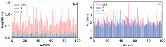 Figure 7 illustrates the distribution comparison between the QRS complexes and other ECG waveforms, in which QRS, P and T waves were extracted from the QT Database [32], and the number of each wave is 100. In Figure 7, the amplitude and kurtosis distributions of the main waveforms in ECG signal are plotted; it can be seen that there is are significant differences between the QRS complex and P/T wave in amplitude and kurtosis values. In statistics, a higher kurtosis means that the increase in variance is caused by extreme differences in low frequencies that are greater or less than the average.