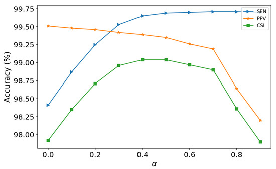 In this work, the performance of the proposed method was influenced by the amplitude and kurtosis thresholds; that is, the superparameter in Equations (7) and (8) had a large effect on experimental results. The is a superparameter which represents the weight of R-peaks amplitude or kurtosis. In Figure 8, we plot the R-peak detection performance of the proposed method with different values. In Equations (7) and (8), larger means lower thresholds and more FP, which results in lower PPV. On the contrary, smaller means higher thresholds and can lead to more FN and lower SEN. From 8, we can see that achieved the best CSI; meanwhile, better SEN and PPV were obtained.
