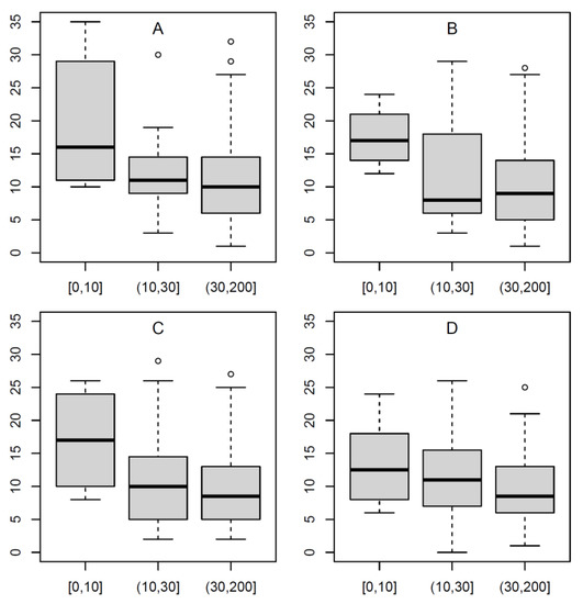 Distribution of the content completeness score for the four search queries (A–D) in three classes of the ranking of the query result: 1 to 10, 11 to 30, and 31 to 200, based on the initial, unfiltered search (definition of search query (A–D), see Section 2).