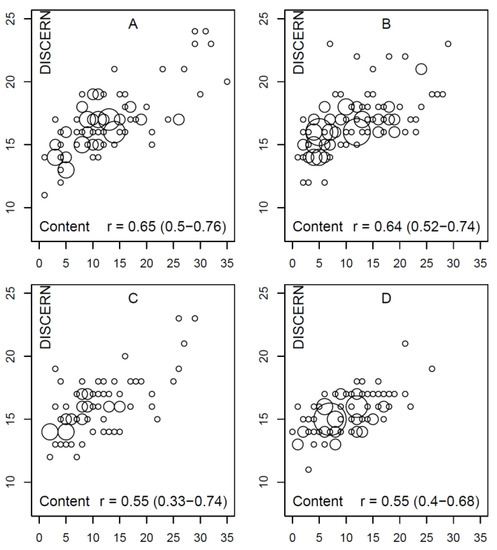 Correlation between the content completeness score (x-axis) and the DISCERN total score (y-axis) for the four search queries (A–D) as so-called “bubble plot”, where the size of the circle represents the frequency of co-occurrence of the score values (definition of search query (A–D), see Section 2).