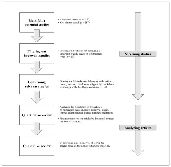 This study conducts a quantitative and qualitative review to effectively illuminate the main research streams regarding blockchain technology in healthcare. Our quantitative review aims at not only revealing the main research streams in terms of the distribution of relevant studies by their publication year, language, country of origin, journal, and the annual average numbers of citations, but also identifying the top ten articles ranked by their annual average numbers of citations. Our qualitative review focuses on analyzing the main content trends in the top ten articles using the solid theoretical basis of Leavitt’s diamond model [12]. The following two subsections describe the quantitative and qualitative methods used for this review, and Figure 1 summarizes our review flow.