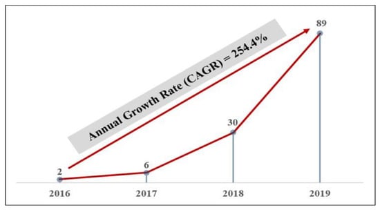 First, the number of articles has dramatically increased since 2016. These articles began being published in 2016. In 2016, only two articles were published. Since then, however, the number of published articles has grown rapidly, with a high compound annual growth rate of 254.4%, as shown in Figure 3. In greater detail, 6 and 30 articles were published in 2017 and 2018, respectively. In 2019, 89 articles were published, further showing the rapid growth in publication volume.