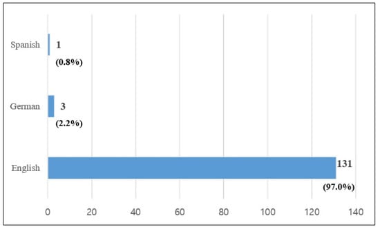Second, English is the most dominant language used across the 135 articles. A total of 131 articles were written in English (97%). The other four articles included three in German (2.2%) and one (0.8%) in Spanish, as summarized in Figure 4.