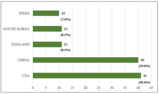 Third, the USA, China, England, South Korea, and India are the top five countries of origin. A total of 41 articles could be traced to researchers in the USA (30.4%), 40 from China (29.6%), 11 from England (8.1%), 11 from South Korea (8.1%), and 10 from India (7.4%), as shown in Figure 5. Appendix A reports the distribution by country of origin for all 135 articles.