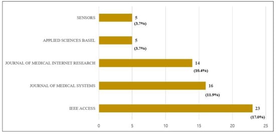 Fourth, the IEEE Access, Journal of Medical Systems, Journal of Medical Internet Research, Applied Sciences Basel, and Sensors are the top five journals in terms of their share among 61 journals in which the 135 articles were published. A total of 23 articles were published in the IEEE Access (17.0%), 16 articles in the Journal of Medical Systems (11.9%), 14 articles in the Journal of Medical Internet Research (10.4%), 5 articles in the Applied Sciences Basel (3.7%), and 5 articles in the Sensors (3.7%), as summarized in Figure 6. Appendix B reports the specific distribution of all journals.