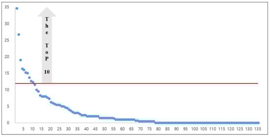 Fifth, the 135 articles show an L-shaped distribution as illustrated in Figure 7, arranged by their ranks in terms of the annual average number of citations. The minimum, median, and maximum values of the L-shaped distribution were 0, 0.67, and 34.6, respectively. Table 1 reports the top ten articles regarding the annual average number of citations. Their values all exceeded 12.