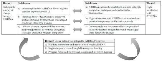 Conceptual model of ATHENA’s mechanisms of action. Note: Themes 1 and 2 interacted with each other, in that: (i) despite initial scepticism of ATHENA (due to negative personal experience with UI), participants’ expectations were exceeded and they found the program highly acceptable; and (ii) educational and practical components of ATHENA (and the way in which they were delivered) were found to be highly acceptable, and resulted in increased knowledge/awareness about UI, improved attitudes towards treatment, enactment of lifestyle changes and, consequently, improvement in UI symptoms. Theme 3 was overarching and acted as a moderator to the intervention as a whole.