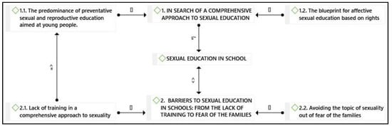In accordance with current literature on the topic, our study highlights that the common approach to this type of education is based on abstinence, prevention and reproduction [,], and that it is awkward, unhelpful and often uses scare tactics []. Various authors have concluded that SE based on abstinence does not reduce sexual activity itself or when young people start to engage in it [,]. Moreover, society’s view of sexuality differentiates gender roles. For example, virginity is seen as a virtue in women whereas it is considered a flaw in a man []. However, it is possible to modify traditional stances due to socio-cultural changes related to gender identity and ideology []. A comprehensive approach to SE does not only prevent disease and unwanted pregnancies but also prevents homophobic bullying, domestic violence and child abuse []. Furthermore, it promotes healthy relationships, socioemotional learning and media literacy [,]. The participants of the study argue that the lack of training and the fear of the families are barriers to a comprehensive and open-minded approach to sexuality in schools.