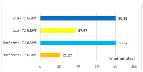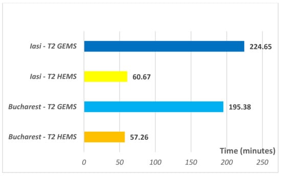As for the patients’ processing time from the emergency department by the transfer crew (T1), it is significantly lower (p < 0.05) for patients who benefited from air transfer (Table 2), regardless of the PCI center to where the transfer was made, Iasi or Bucharest (Figure 1). This could be explained by a more thorough selection of patients eligible for air transfer in the dispatcher’s office (comas, stroke, trauma, STEMI) when compared to ground teams which have the commitment to respond to all requests made to the emergency number 112. Moreover, both a nurse and a doctor are mandatory for air transfer, while for ground transportation it is oftentimes necessary to wait for the full crew to form (nurse and doctor), who may be involved in responding to other emergencies. Specialty literature does not provide specifics regarding the ambulance crews’ reaction times to the requests made from the emergency departments for the transfer of patients to a PCI center, either by air or land. The T2 transfer time represents the time spent while travelling by air or by ground ambulance to PCI centers, and the differences between the two ways of transportation are statistically significant (p < 0.000). The air transfer is at least three times faster than its land counterpart (Figure 2). Even with a much lower timeframe ensured by air transportation, only 80% of STEMI patients transferred by HEMS arrived at the PCI centers in the target range for PCI specified by the therapeutic guidelines, namely only those patients that did not encounter any delays in processing them from the admission area. No ground transferred patients reached PCI centers in less than 120 min.