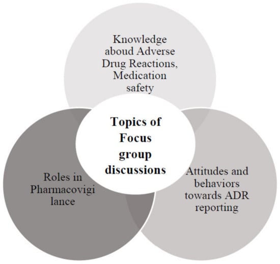 FG discussions were performed from December 2019–October 2020. Before starting a discussion, the moderator used an explanatory statement to describe the study objectives. Written informed consent was then obtained from each participant. Every participant was informed that the interview would be recorded. The moderator assured that confidentiality and anonymity would be strictly maintained. A question guide was developed after reviewing previous studies on ADR reporting [15,16]. A summary of the topic guides used for the FG discussions is presented in Figure 1.
