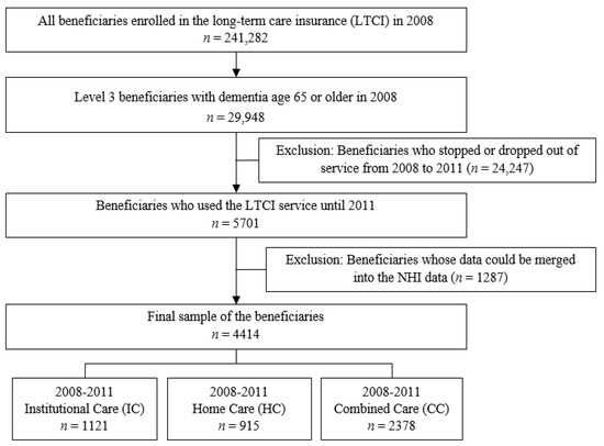 We identified participants from the LTCI data set based on the following criteria: (1) aged 65 or older, (2) with dementia, (3) classified as level 3, (4) continued to use LTCI from 2008 to 2011, and (5) whose data could be merged into the NHI data. In 2008, there were 29,948 beneficiaries (65 years and above) with dementia who belonged to the level 3 category of the LTCI. This accounted for 0.60% of the Korean population over 65 years old and 7.1% of the older adults with dementia in 2008 over 65 years of age. Of these, 5701 beneficiaries continued to use LTCI up to 2011. Since the medical cost had to be calculated, 1287 beneficiaries whose data could be merged into the NHI data were excluded. The final sample of this study was 4414 beneficiaries. Figure 1 shows the study sample selection flow over four years (2008–2011).
