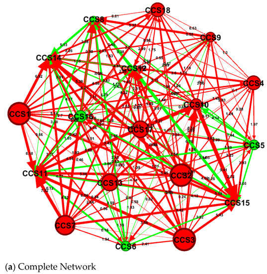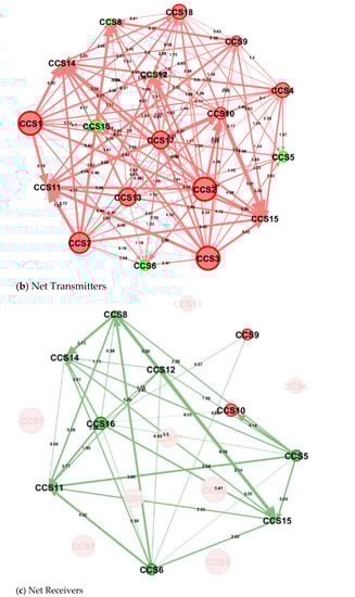 Static connectedness network structure of net-pairwise directional connectedness indices (NPDCI). (a) Complete Network: total connectedness index (TCI) is 87.20%. The size of nodes indicates the overall magnitude of transmission/reception of spillover for each clinical classification system (CCS) code. Red (green) color for a node denotes a specific CCSi (i = 1, 2,…, 18) that is a net transmitter (receiver). The thickness of arrows reflects the strength of the spillover between a pair of CCS codes. Thicker arrows indicate stronger spillovers between two CCS codes. (b) Net Transmitters: Ten of these eighteen clinical diagnosis-related groups of diseases (these being infectious and parasitic diseases (CCS1), neoplasms (CCS2), endocrine, nutritional, and metabolic diseases and immunity disorders (CCS3), diseases of the blood and blood-forming organs (CCS4), diseases of the circulatory system (CCS7), diseases of the digestive system (CCS9), diseases of the genitourinary system (CCS10) diseases of the musculoskeletal system and connective tissue (CCS13), symptoms, signs, and ill-defined conditions and factors influencing health status (CCS17), and residual codes unclassified diseases (CCS18) are net transmitters of spillover. (c) Net Receivers: The other eight of these eighteen clinical diagnosis-related groups of diseases (these being mental illness (CCS5), diseases of the nervous system and sense organs (CCS6), diseases of the respiratory system (CCS8), complications of pregnancy, childbirth, and the puerperium (CCS11), diseases of the skin and subcutaneous tissue (CCS12), congenital anomalies (CCS14), certain conditions originating in the perinatal period (CCS15), and injury and poisoning (CCS16)) are net receivers of spillover.