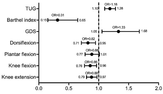 The results of the binary logistic regression analysis showed that use of a walking aid, knee flexion and extension strength, ankle dorsiflexion strength, depression, speed and level of ADL are the variables that are significantly associated with balance impairment. Participants requiring a walking aid had a higher prevalence of balance impairment (77.8%), and were ten times more likely to have their balance impaired post-stroke in comparison to non-aid requiring patients (odds ratio (OR) = 10.8 (95% CI = 3.827–30.577)) (Table 2). The strength of dorsiflexors (OR = 0.820 (95% CI = 0.710–0.947)), knee flexors (OR = 0.858 (95% CI = 0.763–0.964)) and knee extensors (OR = 0.880 (95% CI = 0.797–0.972)) were all factors that increased the risk of balance impairment in patients after stroke, which has been illustrated in Figure 1, showing the odds ratio and 95% confidence interval of each variable. Speed was another variable that affected balance; with every increment in TUG score, the patient becomes more susceptible to having their balance affected (OR = 1.187 (95% CI = 1.100–1.2800). Similarly, for every increase in depression, the patient’s risk of balance impairment also increases (OR = 1.331 (95% CI = 1.055–1.679)). When the level of ADL decreases, the risk of balance impairment was also shown to increase (OR = 0.313 (95% CI = 0.150–0.650)).