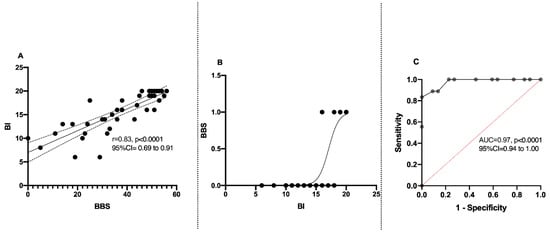 Relation between balance (BBS) and Barthel index (BI): (A) correlation between BBS and BI; (B) regression curve on BBS and BI; (C) ROC curve between BBS and BI.