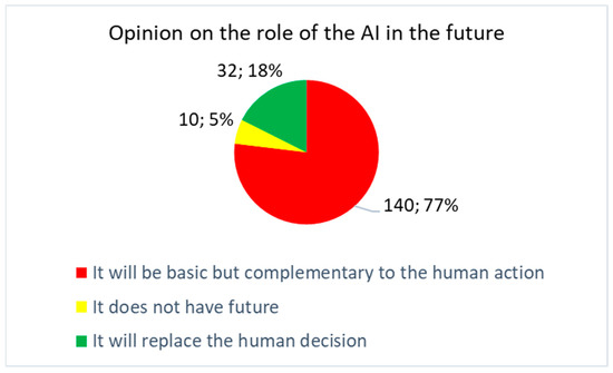 Figure 5 shows the answers to the multiple choice question #18 (Figure 2): “What is your opinion about the future of AI in digital radiology after the COVID-19 pandemic?” The result showed that, with a very high percentage of 87%, it is believed that AI will make a complementary contribution. Only 10% believed it will replace human decision. Only 3% believed it has no future.