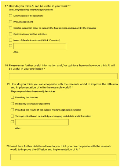 From a general point of view, the questionnaire was a general purpose tool intended for a wide category of professionals. In this study, the outcome of a category of strategic professionals in digital radiology, that of MRTs, was evaluated. From this outcome and the review process, important considerations and suggestions emerged for the finalization of a specific tool for this figure to be used in scientific societies. The link below allows you to access and see some specializations prepared, and see the survey currently: https://forms.office.com/Pages/ResponsePage.aspx?id=DQSIkWdsW0yxEjajBLZtrQAAAAAAAAAAAAZ__gdk7kpUQ001Nk5ORDVPMjk0M0g4RkdPQkdOOUwwSi4u (accessed on 13 March 2021).