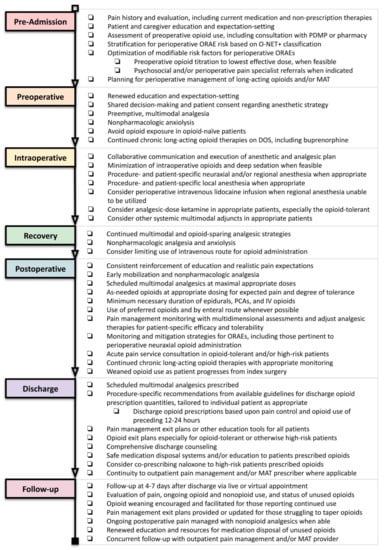 Perioperative care consists of a complex orchestra of medical professionals, physical locations, processes, and temporal phases. This continuum begins prior to the day of surgery (DOS), continues across inpatient or ambulatory stay, and extends through recovery and follow-up phases of care. A maximally effective institutional strategy for perioperative pain management and opioid stewardship includes all phases and providers across this continuum. Though there is no definitive evidence-based regimen, effective multimodal analgesia requires institutional culture and protocols for pre-admission optimization, consistent use of regional anesthesia, routine scheduled administration of nonopioid analgesics and nonpharmacologic therapies, and reservation of systemic opioids to an “as needed” basis at doses tailored to expected pain and preexisting tolerance [,,]. Figure 1 summarizes the recommended strategies at each phase of care, which will be discussed in greater detail.