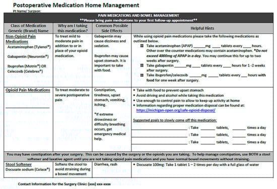 - Genord, C.; Frost, T.; Eid, D. Opioid exit plan: A pharmacist’s role in managing acute postoperative pain. J. Am. Pharm. Assoc. 2017, 57, S92–S98. [Google Scholar] [CrossRef]