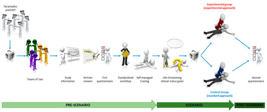 The scenario will start with a clinical statement to recognize the life-threatening condition of the patient, given by one of the investigators as follows: «Here is Michael, a 50-year-old man who suddenly collapsed 10 min ago. He is now unconscious, pale and seems not to be breathing. The medical reinforcement is already underway and will be on site in about ten minutes. No first responder has been dispatched by the EMMC, and no bystander is on scene». The team leader will be asked to reformulate this statement (closed-loop communication) to ensure comprehension. He will then choose and open one of the envelopes of the stack. The opaque, sealed envelope will contain the approach they will have to apply: current practice approach or experimental approach. From this point on, there will be no more contact between the participants and the study team, except to stop the scenario.