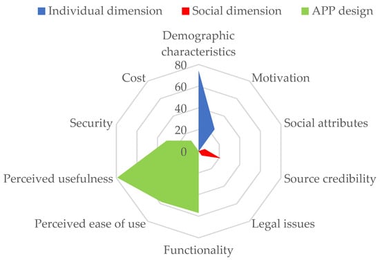 | Demographic characteristics (74) | Age | Mobile health applications are mainly used by the young, while seniors, especially those aged over 70, seldom adopt or use mobile health applications | [15,16,17,18] |