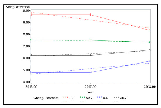 Figure 1 displays the sleep duration trajectory groups among the physically disabled population. A four-group linear solution for trajectories of sleep duration fit the data best in the trajectory analysis. This model had limited information criteria values (AIC, BIC, sample-size adjusted BIC) relative to other group solutions. Trajectory group 1 (4.0% of the sample) was characterized by the highest levels of sleep duration with a slight constant over time. Trajectory group 2 (50.7% of the sample) had appropriately constant levels of sleep duration, while trajectory groups 3 and 4 had low levels of sleep duration, with 8.6% and 36.7% belonging to this class, respectively (Figure 1).