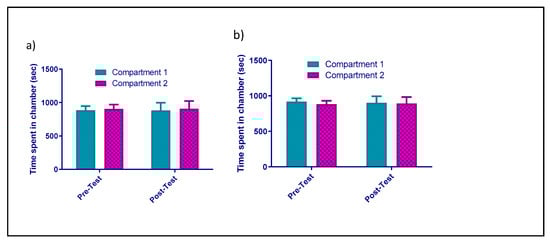Two-way ANOVA with repeated measures (time × compartment) was used for the evaluation of the time spent in the pregabalin- or saline-paired chamber during the habituation and conditioning periods. This statistical analysis was chosen on the basis of previous studies [,,,,,]. When significant effects were discovered, Tukey’s multiple comparison post hoc test was applied. Data were analyzed using GraphPad Prism (GraphPad Software, San Diego, CA, USA), with the level of significance set at p < 0.05.