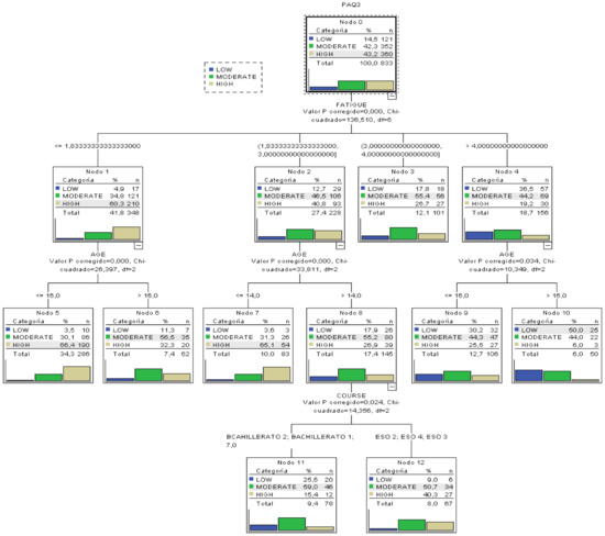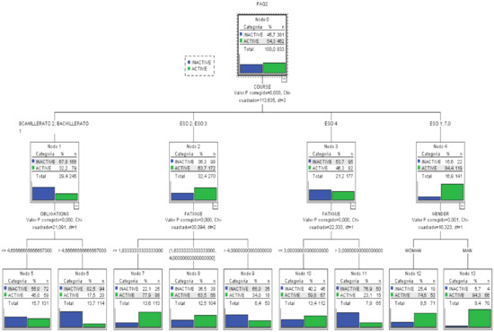 Moreover, to explain the results of the three categories model, the classification tree of active and inactive adolescents was also calculated. That classification follows the model by Benítez-Porres et al. [35], setting the discriminant value between classes as 2.75.