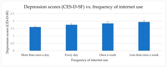 Mean depression scores (w/standard errors) vs. frequency of internet use. A significant main effect of frequency was observed (p = 0.01), and there was a significant difference between the most and least frequent users (p < 0.001).