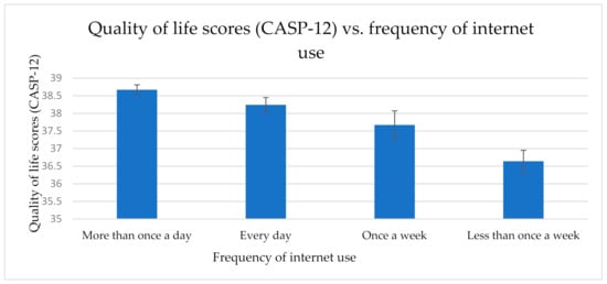 A one-way (frequency of internet use: more than once a day, every day, once a week, or less than once a week) between-groups analysis of covariance (ANCOVA) was conducted with QoL (CASP-12) as the dependent variable. We controlled for age, gender, net household wealth, current employment status, the number of people in the household, and education. There was a significant main effect of frequency of internet use, F(3, 3481) = 11.82; p < 0.001; ŋp2 = 0.01. More frequent use was associated with higher QoL scores: more than once a day (M = 38.67; SE = 0.14), every day (M = 38.24; SE = 0.21), once a week (M = 37.67; SE = 0.40), and less than once a week (M = 36.64; SE = 0.31) (Figure 2). The pairwise comparisons (with a Bonferroni correction) identified a significant difference between Group 1 (more than once a day) and Group 4 (less than once a week), p < 0.001; and between Group 2 (every day) and Group 4 (less than once a week), p < 0.001.
