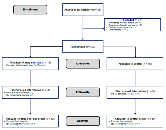 Study flow chart based on Consort 2010 Flow Chart Diagram. The first 36 elderly women were enrolled for our experiment, but 6 were excluded because they were not suitable for the study. Thirty participants were randomly assigned to the Aquatic exercise group and the Control group, and the final subjects were Aquatic exercise (n = 12) vs. the Control group (n = 10).