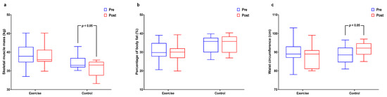 Effect of 12 weeks of aquatic exercise on body composition in elderly Korean women. (a) SMM of control decreased significantly (p < 0.05); (b) % BF showed significant interaction effects (p < 0.05); (c) WC of control increased significantly (p < 0.05). SMM: skeletal muscle mass, % BF: percentage of body fat, WC: waist circumference.