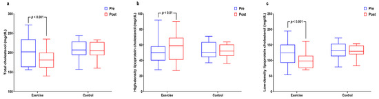 Effect of 12 weeks of aquatic exercise on cardiovascular risk factors in elderly Korean women. (a) TC of the exercise group significantly decreased (p < 0.001); (b) HDL-C of exercise group increased significantly (p < 0.01); (c) LDL-C of the exercise group was significantly decreased (p < 0.001). TC: total cholesterol, HDL-C: high-density lipoprotein cholesterol, LDL-C: low-density lipoprotein cholesterol.