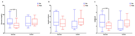 Effect of 12 weeks of aquatic exercise on insulin resistance in elderly Korean women. (a) The glucose of the exercise group decreased significantly (p < 0.01); (b) Insulin showed significant interaction effects (p < 0.05); (c) HOMA-IR of the exercise group was significantly decreased (p < 0.05). HOMA-IR: homeostatic model assessment for insulin resistance.